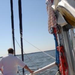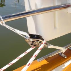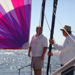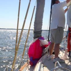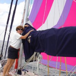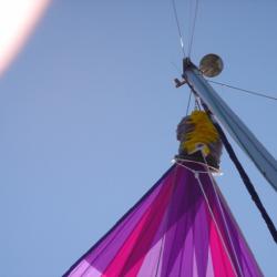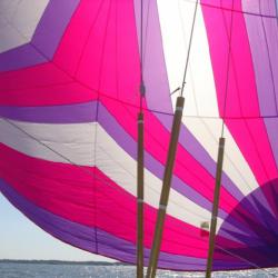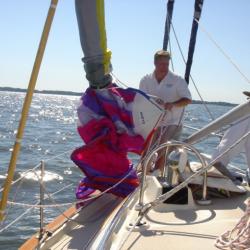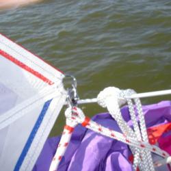 We just added an Asymmetrical sail from Doyle Sails. As part of the package Chuck O'Malley does a 3 - 4 hour tutorial on your boat. The blocks will be changed with snap hook pelicans for easier on-off. It's amazing how will and how close hulled it sails with the Asymmetrical.