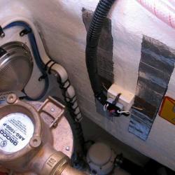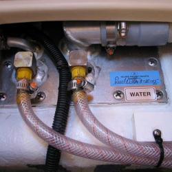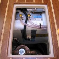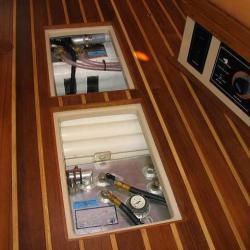 The new IP 440 has a fiberglass water tank under the sole, these photos show the access to the tanks and the bilge area.