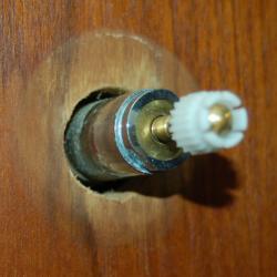 The valves are accessed by first unscrewing the valve cover which also holds the faucet knob in place. Once the valve covers and knobs have been removed then the valve assembly is unscrewed and discarded.