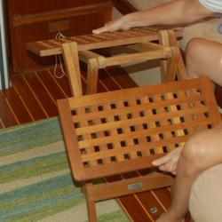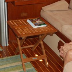 Nine years ago we saw a nice folding teak table that fit perfectly in the salon and also in the cockpit (thanks Blaine of Charbonneau). The table stows out of the way against the bulkhead under the salon table.