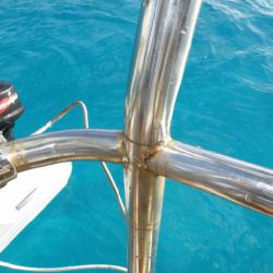 Also, I thought IP owners may be interested in this emergency repair to our Radar Arch. We noticed cracks in the stern pulpit just above the top rail on the support to the davits. The stress on these supports would appear to be primarily in compression so we were surprised to see this type of damage. Because we were in a remote area with the closest welder about 400 miles upwind we had to make an emergency repair. With Fiberglass…