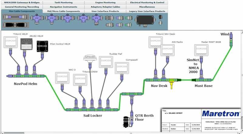 This is the new B&G network Radeen and I built this week on Island Spirit. All cables are run and connected except two arriving Monday. We need to connect this to the 12 volt power and then install all the NavPod gear at the helm. We found this free software for designing NMEA 2000 networks, it is very cool. Next week, we launch on Monday and then move aboard for Mack Sails mast work and Radar install. We are ahead of schedule.