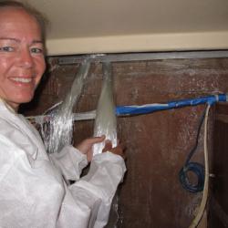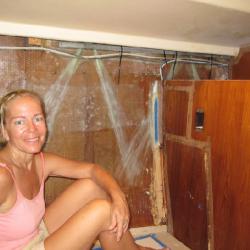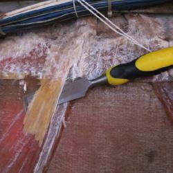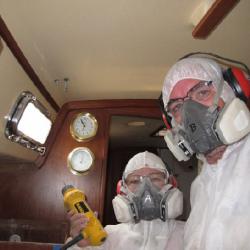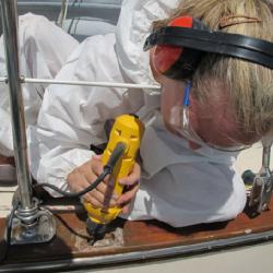 It was a 21 day job for just the two of us. Since we were living on the boat during the work we decided to take it a side at a time, saving the stern chainplates for last. For us, 21 days came to almost 300 man-hours. The chainplates themselves were about $1250 from Island Packet. That included 2 tubes of Silpruf sealant, new deck covers for the new/larger chainplate tabs and the glass strands to do the job. The shipping to Malaysia was about $350. We spent another $400 on epoxy resin, more glass to cover the IP supplied strands and miscellaneous supplies for the job… New respirators, Tyvek suits, couple wood chisels, grinder blades, etc…. We used much more epoxy resin than we had imagined. So the total cost was about $2000 plus the labor, FREE!