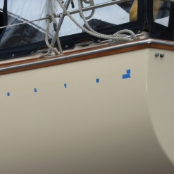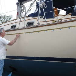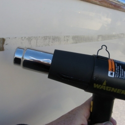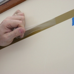 To remove the old stripe, we use a heat gun along with a sharp putty knife. After it was removed, we cleaned the surface and then placed blue tape markers at the bottom edge as a guide as we put on the new stripe. To put on the new stripe, we attached the starting point and then pulled out at least 15 feet of tap and from a distance slowly moved this towards the surface using the guides. This way, with tension on the unrolled tape, you will get a smooth non wavy line.